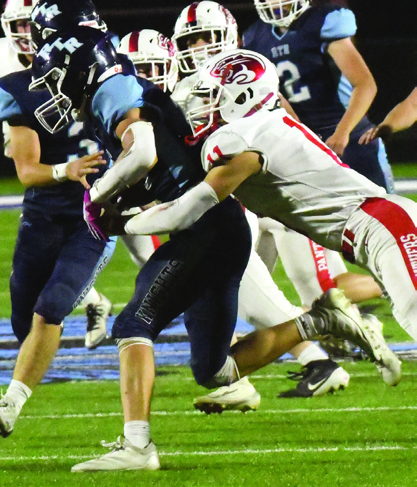 RTR reeled off a 13-play drive on its first second-half possession, a drive in which the Knights overcame back-to-back penalties that resulted in a 3rd-and-24 situation from the TMB 31. However, an 18-yard run by Tyson Burns and a Gavin Schreurs 7-yard pass to Braden Nibbe put the Knights in business with a 1stand-goal from TMB’s 6. A 5-yard gain by Burns put the ball at the 1, and Schreurs finished the drive off with a touchdown run and a 6-0 RTR lead. Tyler Wichmann’s PAT put the Knights up 7-0 with 2:22 left in the third quarter.