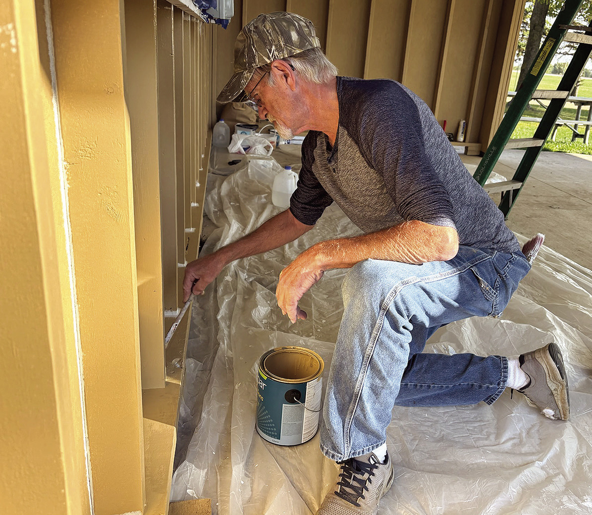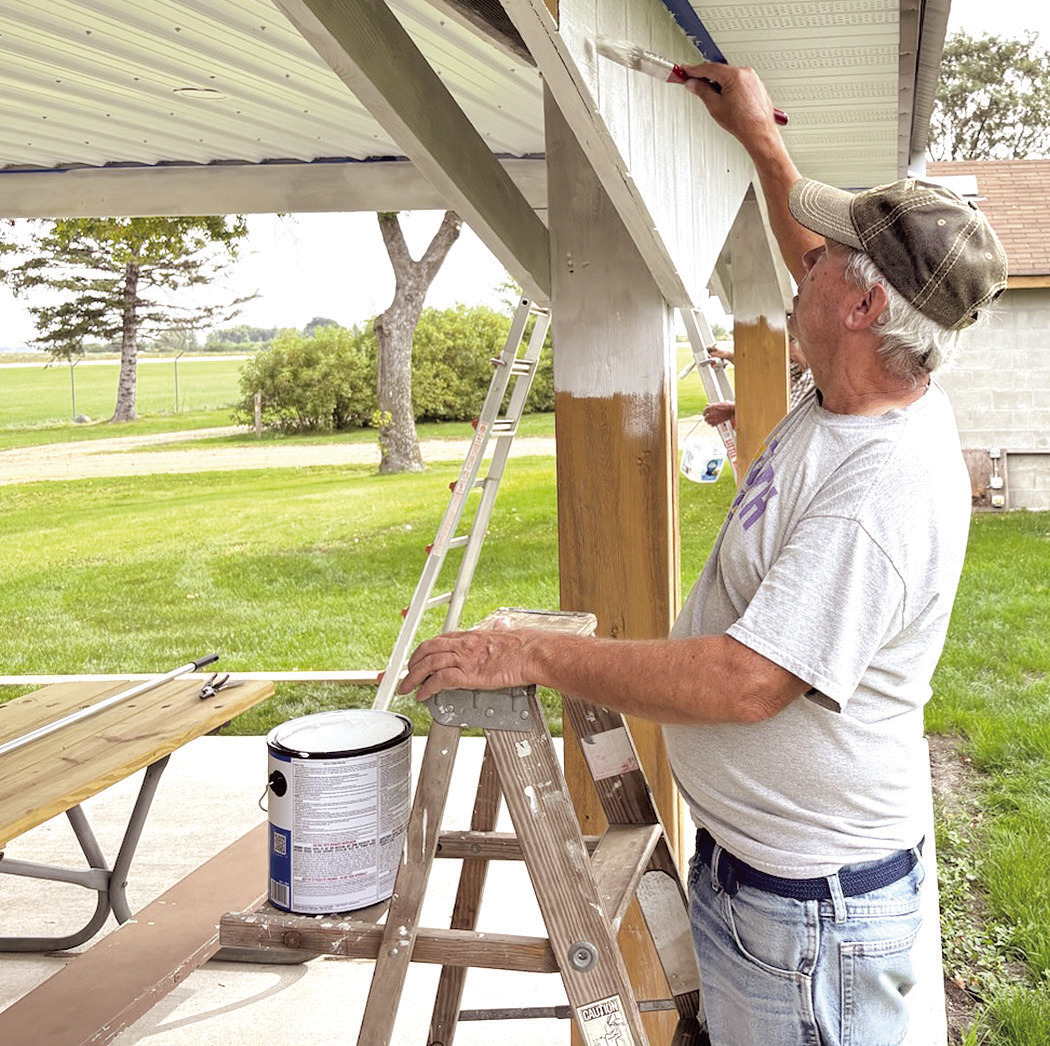 CLOCKWISE FROM ABOVE: Tracy Lions Dennis Fultz, Bob Rialson and Tom Hesse worked this week priming and painting the picnic shelter at Swift Lake Park. The shelter, built in the mid-1980s by the now defunct Tracy Jaycees, was moved to the east by the Lions Club earlier this year. The chosen color is a light brown. Larry Muenchow also helped paint. Photos / Per Peterson