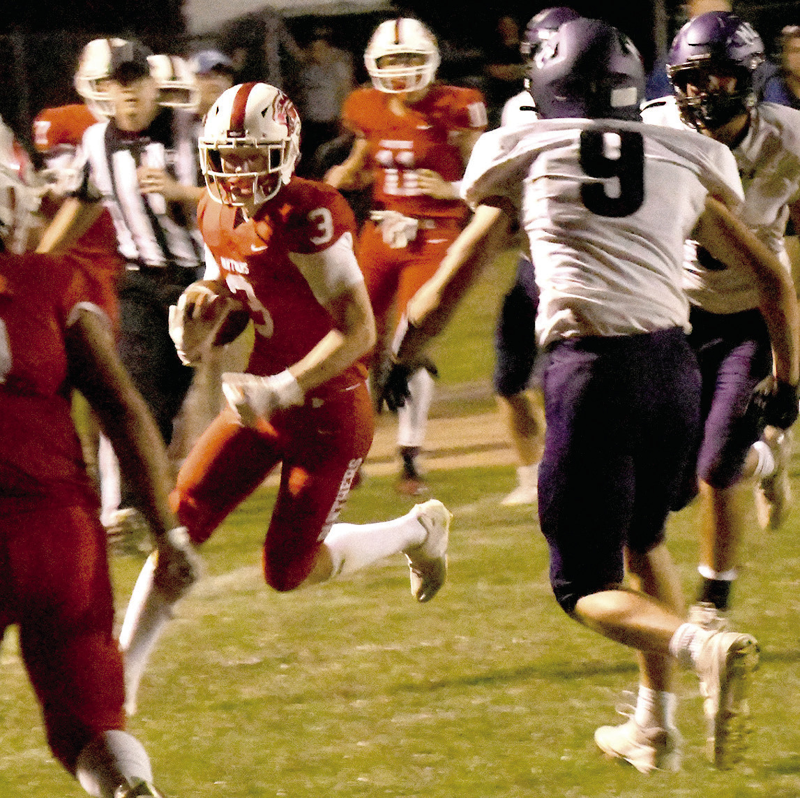 TMB’S TY YACKLEY carries the ball deep into MCC territory after one of his two catches in Friday’s loss to the Rebels. Yackley had two grabs on the night, including his first touchdown of the year in the second quarter.