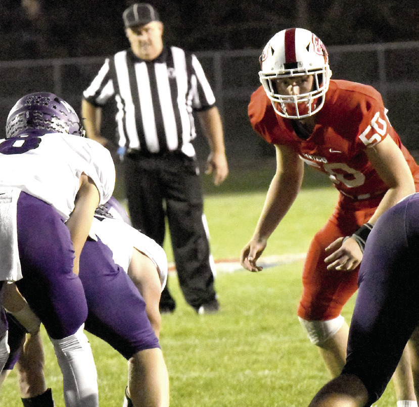TALON BRINKLEY gets ready to rush the quarterback in the first half of last week’s game against MCC.