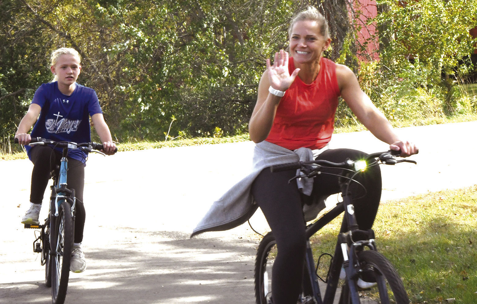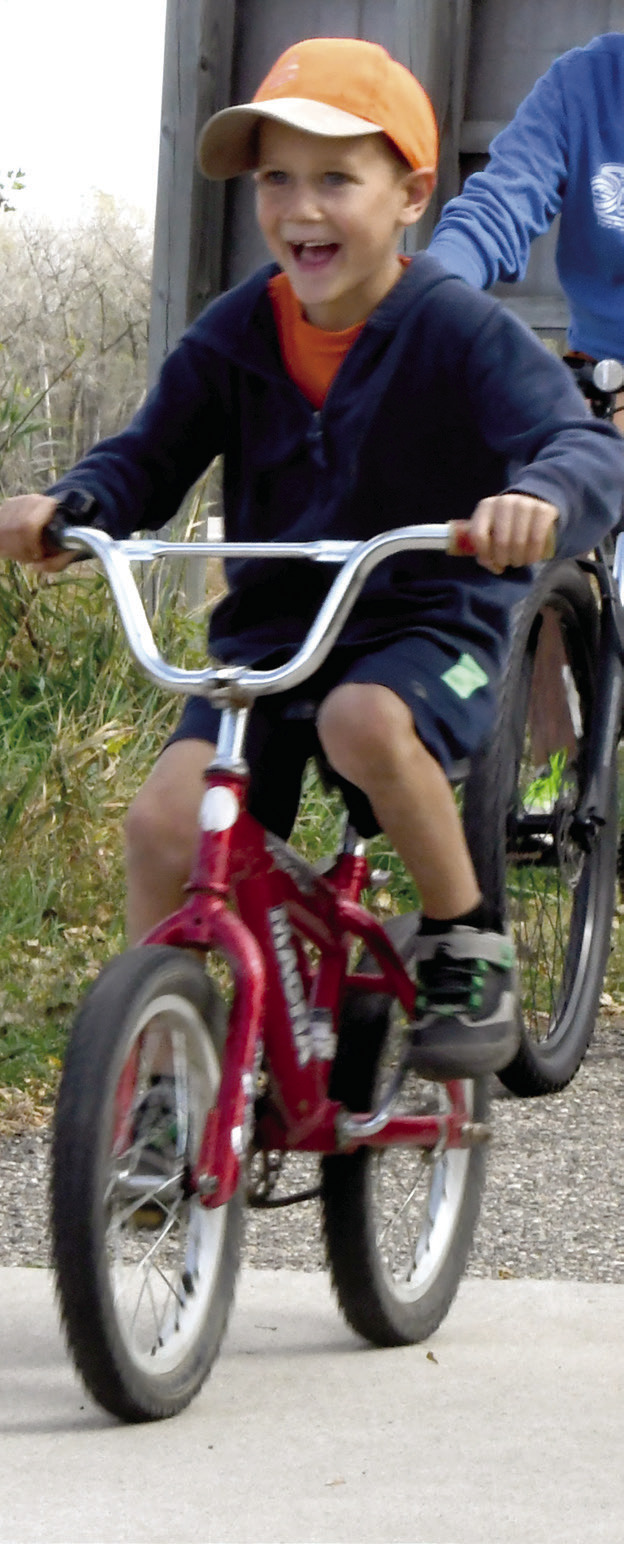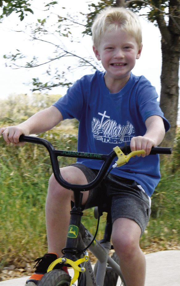ST. MARY’S SCHOOL HELD ITS ANNUAL BIKE MARATHON FUNDRAISER Sunday at the End-O-Line Railroad Park. Kids and adults left from the park en route to the 6-mile Casey Jones biking/walking path. The marathon once took place on Old No. 7, as bikers traveled from the St. Mary’s Church parking lot all the way to Walnut Grove. Seventy-five people took part Sunday, and more than $9,000 was raised for the school. ABOVE: Georgia Peterson leads the way in front of Claire Schreier and Isaac Arnold. Photos / Per PetersonUPPER RIGHT: Conrad LaVoy clearly had a blast riding his bike Sunday. LEFT: Emma Arnold catches up to her mother, Mary, showed waving to the camera. RIGHT: Boden Peterson flashes a big smile as he starts the marathon.