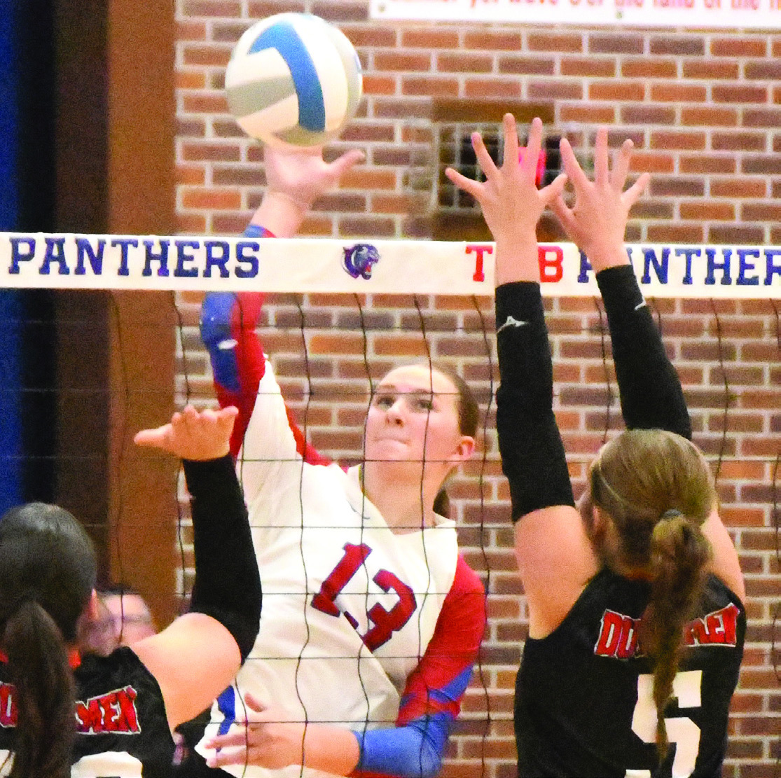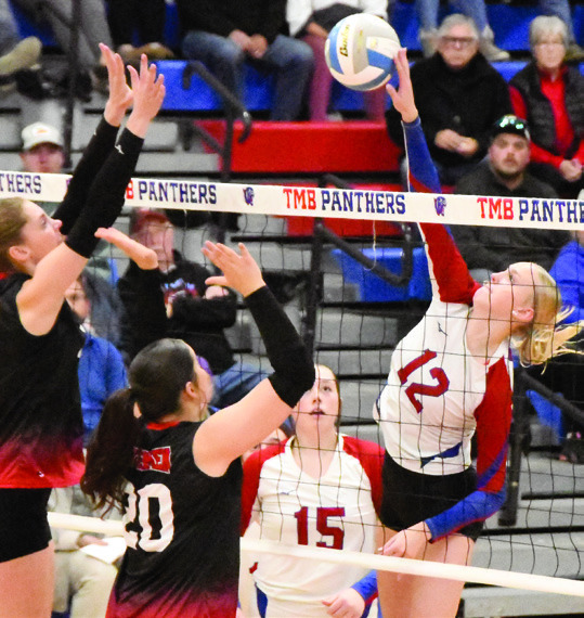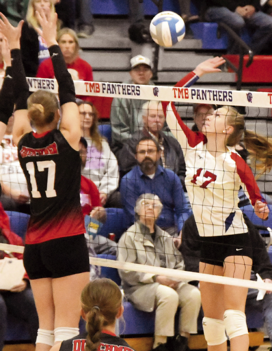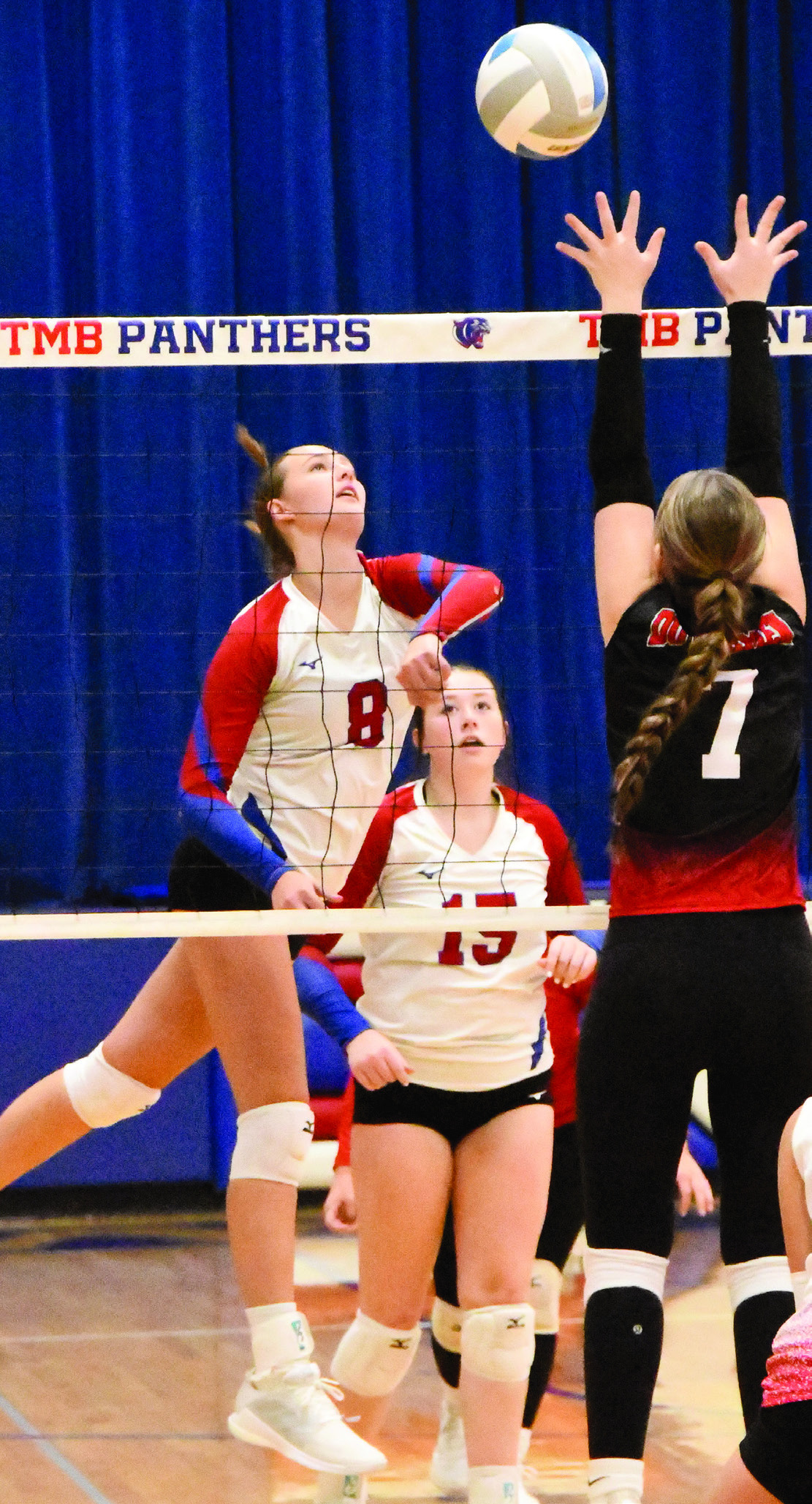 GRETCHEN LANOUE was one of TMB’s blockers who helped neutralize Edgerton senior hitter Reese Vande Griend in the final set of last week’s postseason win.