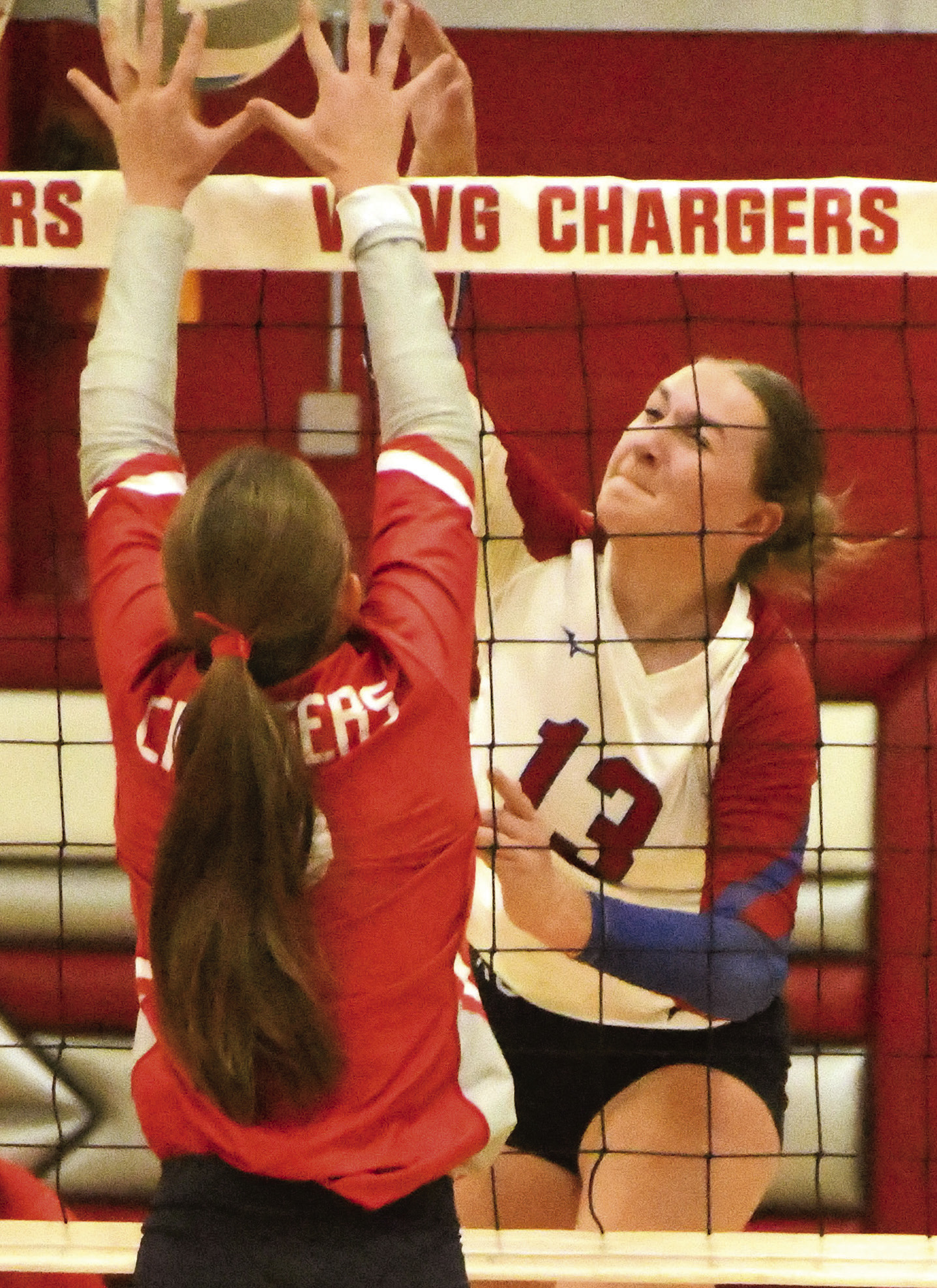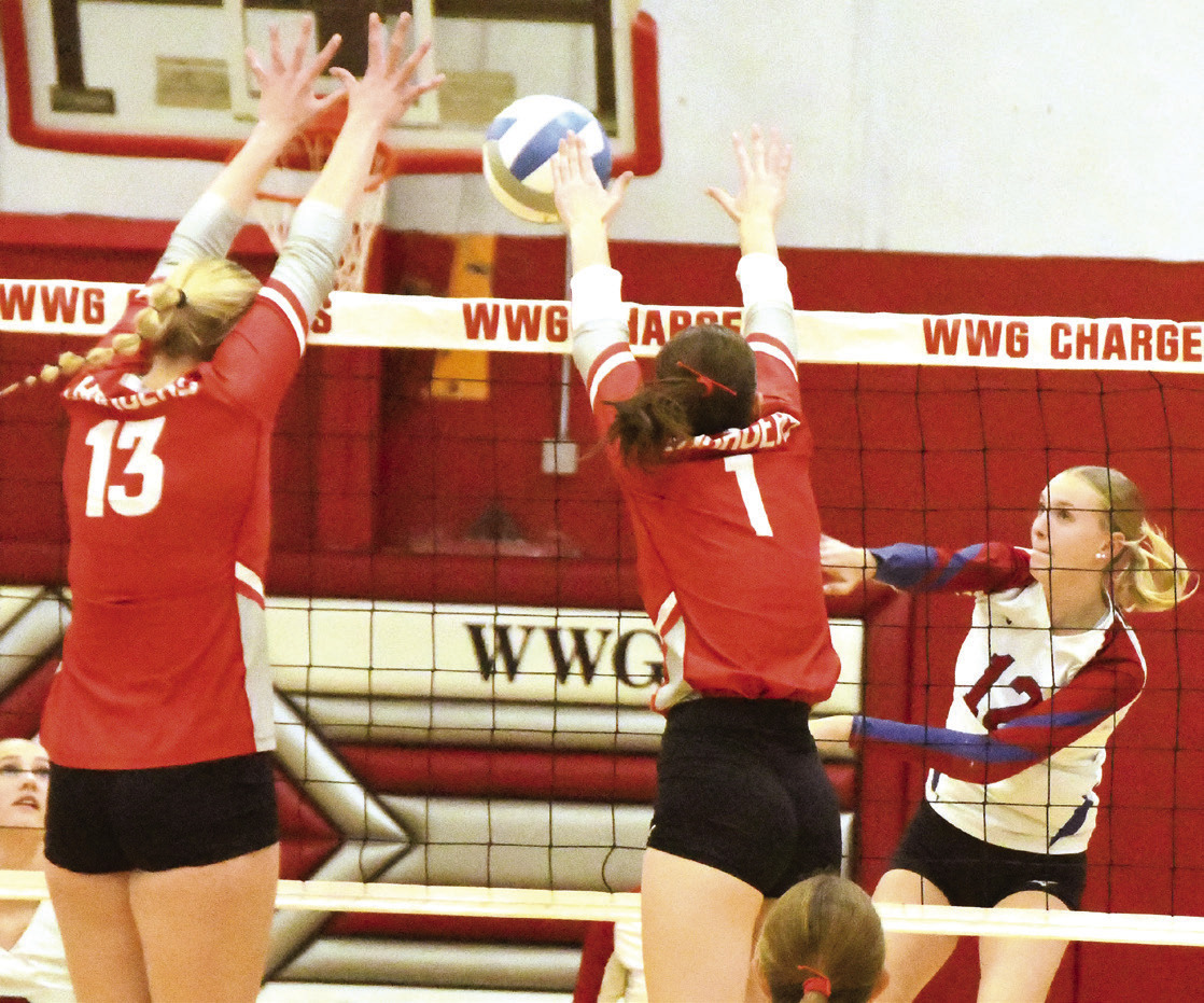 Jenniges. Photo / Per Peterson ALLIE ADAMS blasts a kill against WWG’S Leah Carter (13) and Hadley
