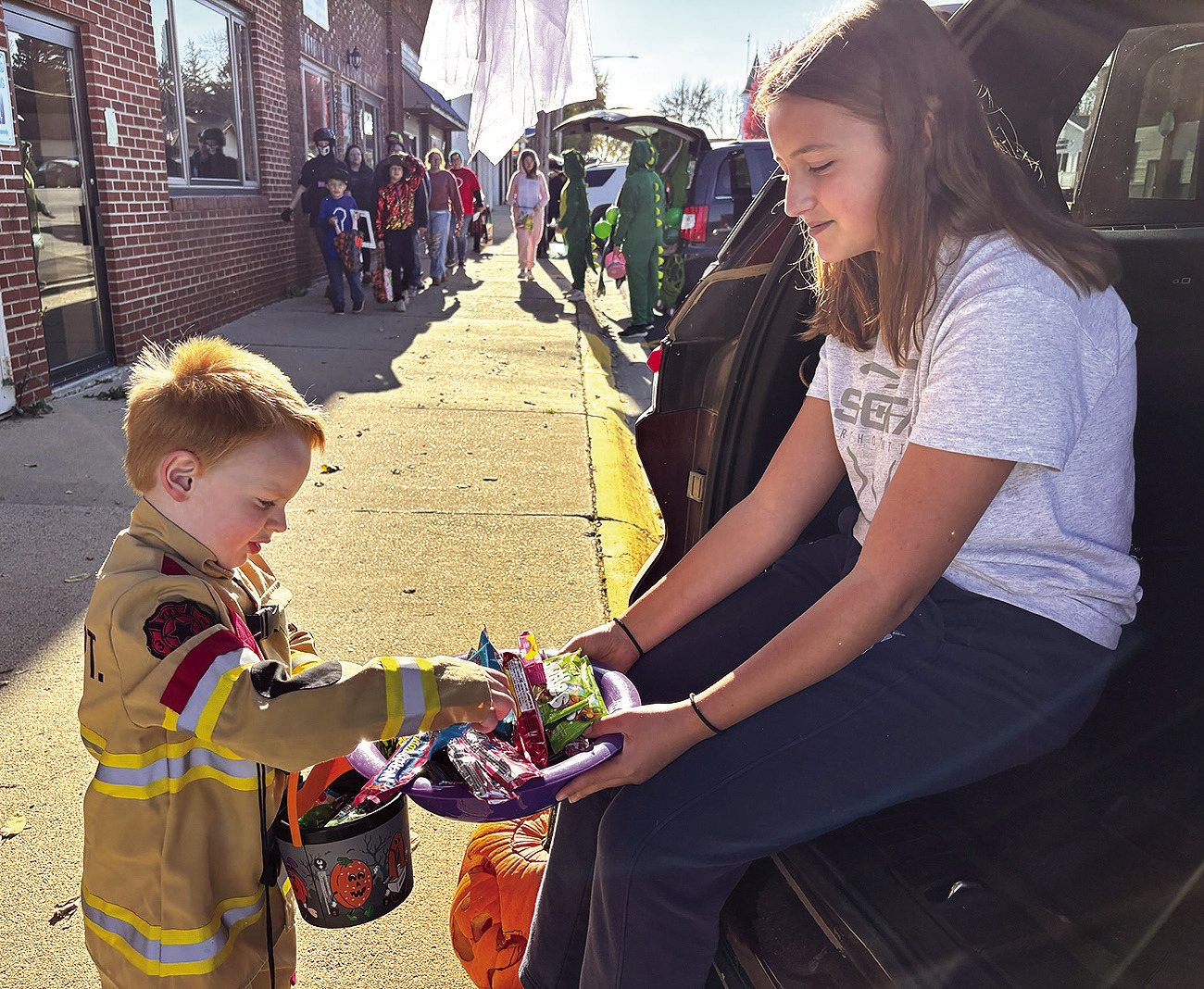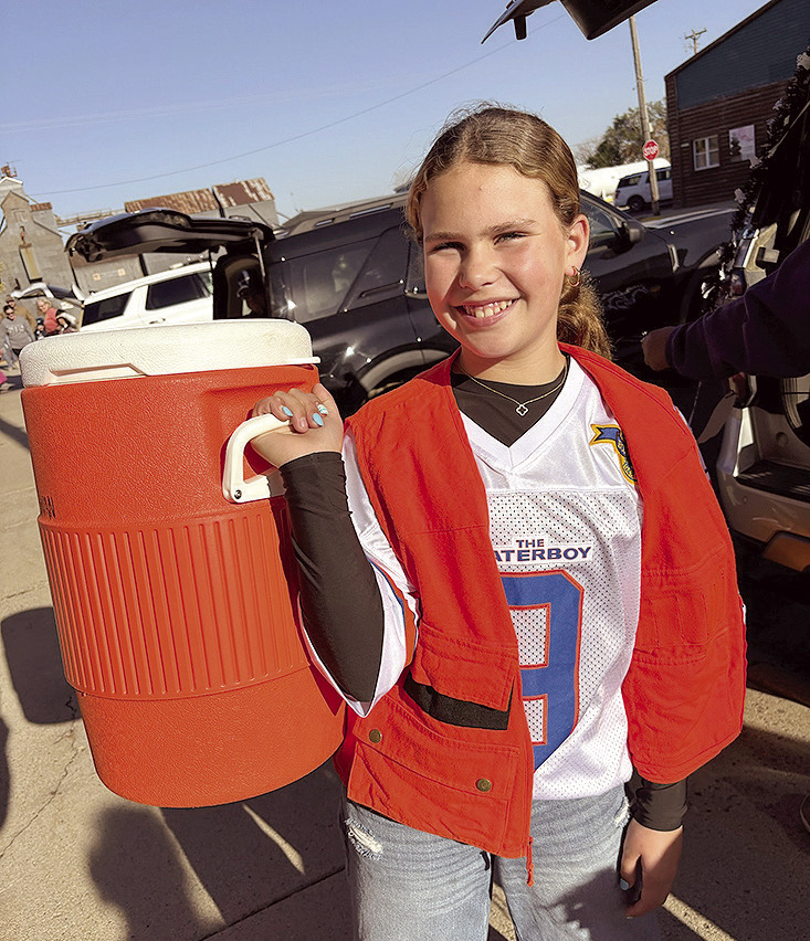 ABOVE: THE SWAN GIRLS — Avery, as a “Moo-dy” cow (top), and Emma, as Bobby Boucher, aka, The Waterboy — were ready for candy well before Balaton’s Trunk-or-Treat event started Sunday afternoon. BELOW: If you guessed Maverick Hall, you’d be right.CASUM TAVEIRNE OF LYND took a break from his firefighting duties to collect some candy at Balaton’s Trunk-or-Treat event Sunday. Photos / Per PetersonBALATON RESIDENTS HAD NOTHING TO WORRY ABOUT CRIME-WISE SUNDAY, as not one, but two Spidermen (Nick and Klay Goblirsch of Lamberton), were there to protect — and to get their webs on some snacks.
