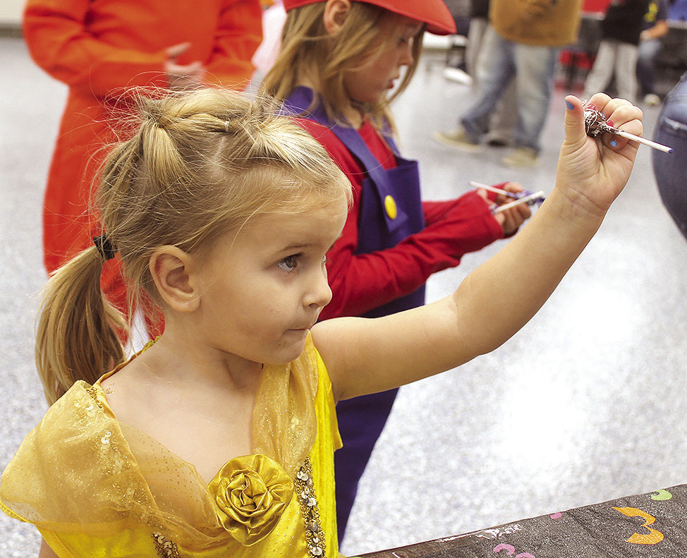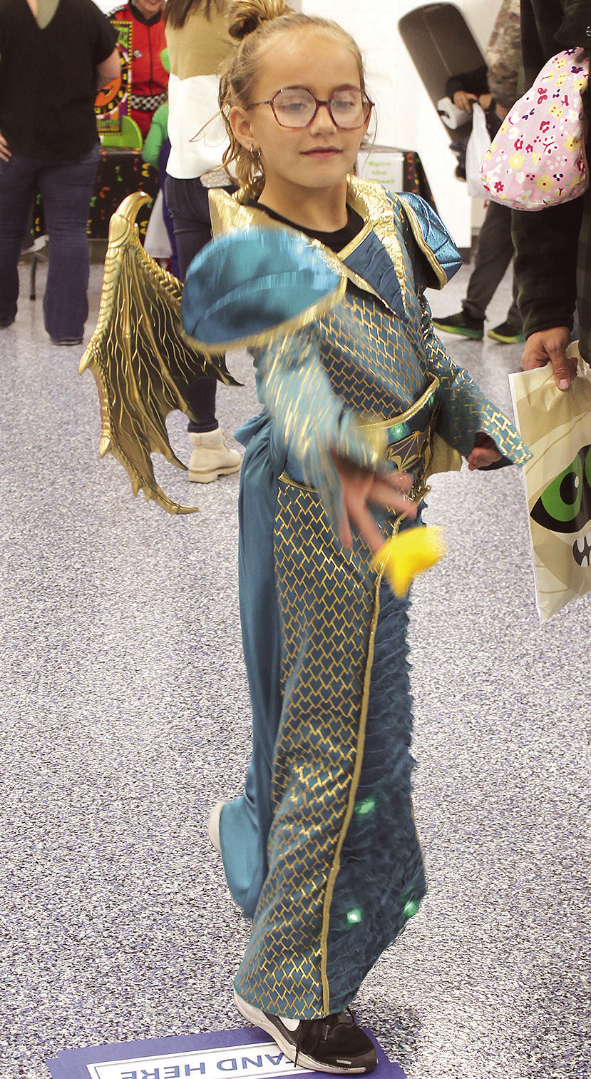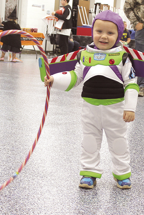 FROM LEFT: HATTIE ERICKSON 7, takes a turn at a beanbag game; RaeLynn Erickson, 3, grabs a sucker to see if she’s won an extra prize; Levi Danielson, 2, aka Buzz Lightyear, is all smiles as he tosses hulahoops at a Minnwest Bank game. Photos / Tara Brandl