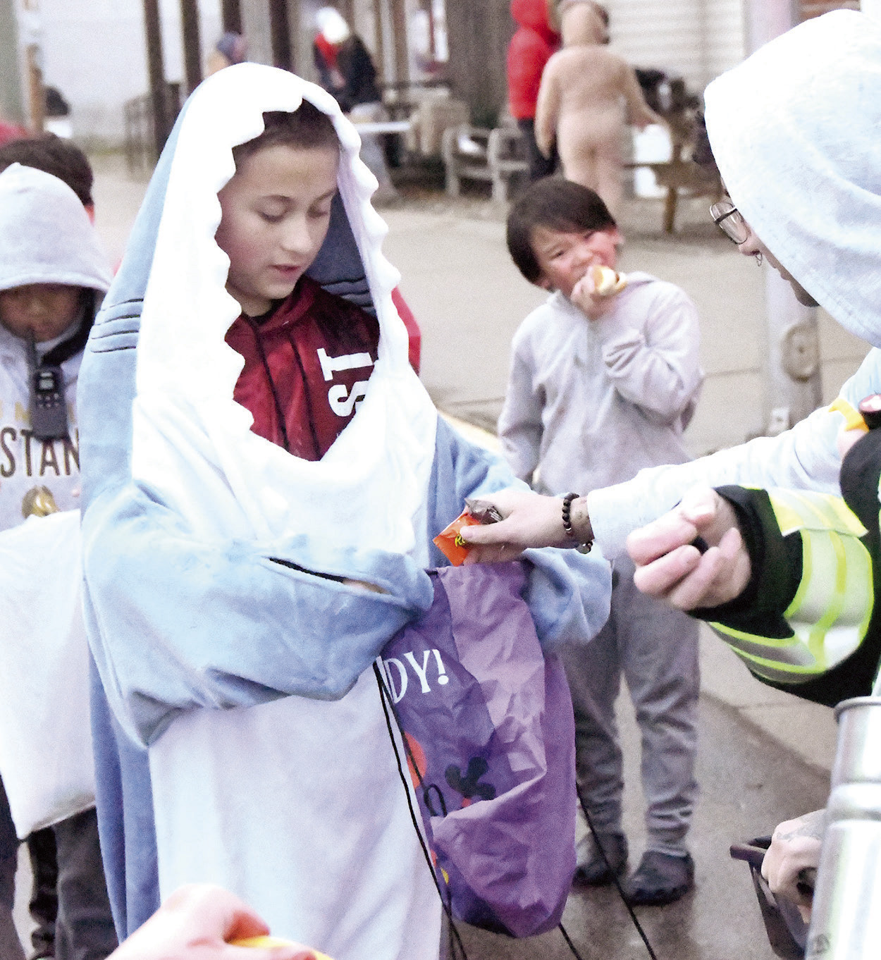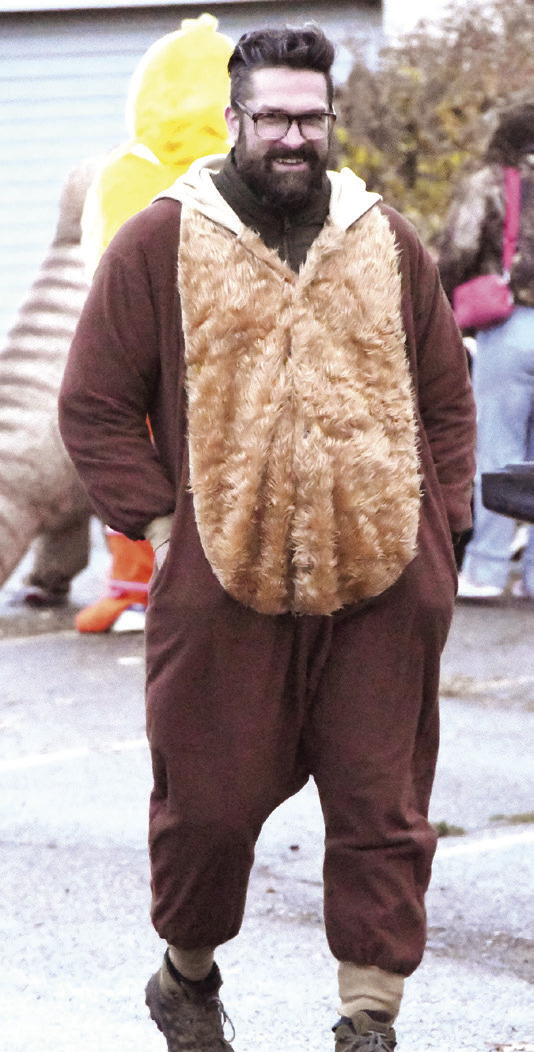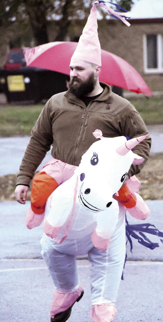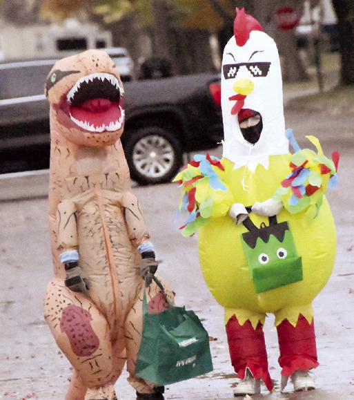 PROUD FATHERS BURKE GARDNER (LEFT) AND MATT DIETER proved at last Friday’s event that even adults can enjoy Halloween.LEVI DESCHEPPER gobbles up some candy at last Friday’s Walnut Grove Community Club’s Main St. Trick-or-Treat event. Local businesses, along with the Walnut Grove Fire Department and Walnut Grove Ambulance, were set up on Main St. for more than an hour, welcoming kids, handing out candy and serving up hot dogs. Photos / Per PetersonLEFT: BEXLEY SCHOBORG races across Main St. as the trick-or-treating was soon to begin. Why did this chicken cross the road? To get some candy, of course.