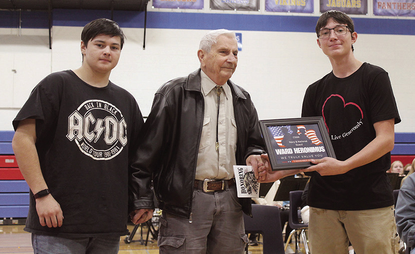 • Over at the elementary school, after the Pledge of Allegiance was recited by the student body, staff and visitors. Student council members spoke about each war, going all the way back to the Revolutionary War. One by one, the students described the circumstances leading up to each war and what the soldiers wore in battle.