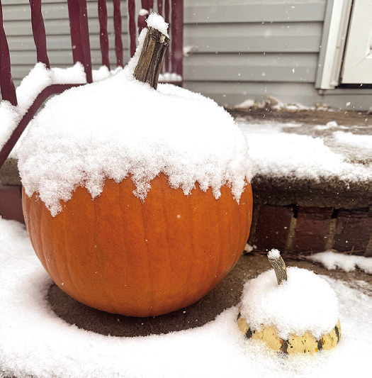 A LIGHT COATING OF SNOW could be found on everything from fallen leaves to pumpkins Saturday morning. By the time you see these photos, the snow will be gone, but it did make us all take notice that winter is ( gulp!) on its way. Photos / above and right Per Peterson, below Tara Brandl