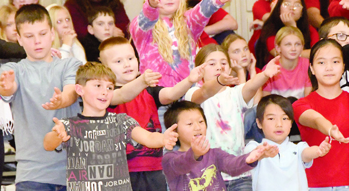 ABOVE: WWG STUDENTS, from left, Aurelia Xiong, Hadli Nelson and Preston Jensen discuss our country’s flags at Tuesday’s Veterans’ Day program were, from left: dafasdfas. LEFT: students performed a number of patriotic songs.