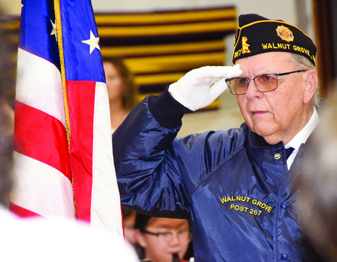 WALNUT GROVE LEGIONAIRRE PAT CAVANAUGH salutes the flag during the Presentation of the Colors on Tuesday.