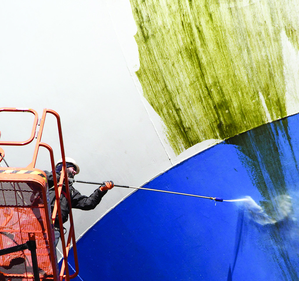 TRACY’S WATERTOWER got a much needed shower last week, as Kelly Lietz of Premium Plant Services powerwashed the bottom half of the bowl. Photos / Per Peterson