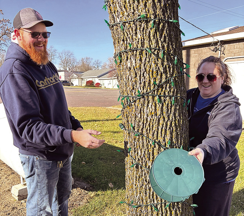 A GROUP OF BALATON RESIDENTS spent some time during a beautiful day last week stringing up lights and placing displays in Legion-Lions Park, just in time for the holidays. ABOVE: Teresa Wendland and Jared Hively set up the Western Mutual lighted arch. RIGHT: Dylan and Brita Fricke have a laugh while wrapping a string of lights around of the park’s 20-plus trees. Photos / Per Peterson