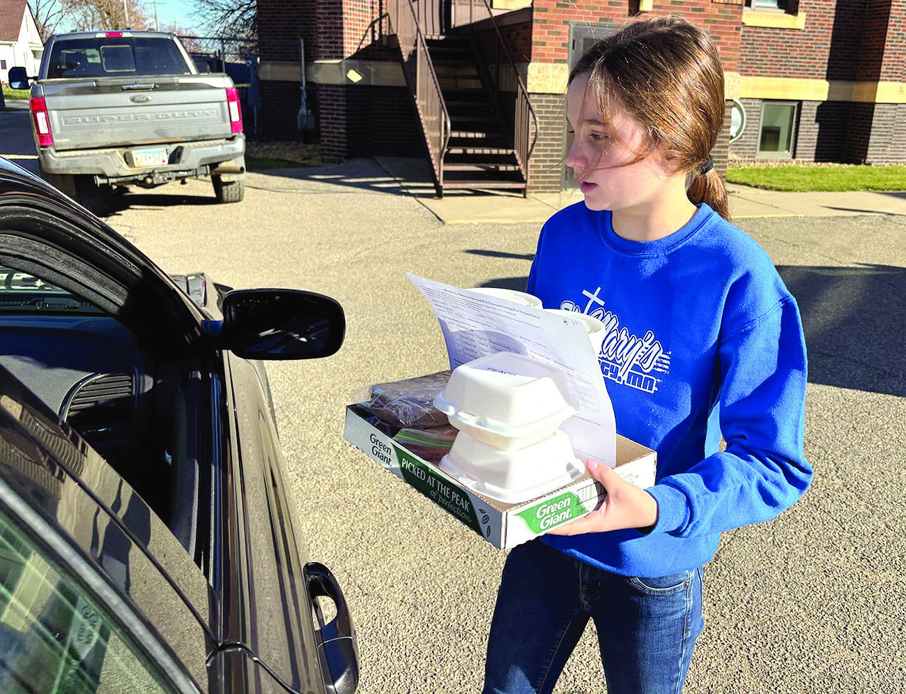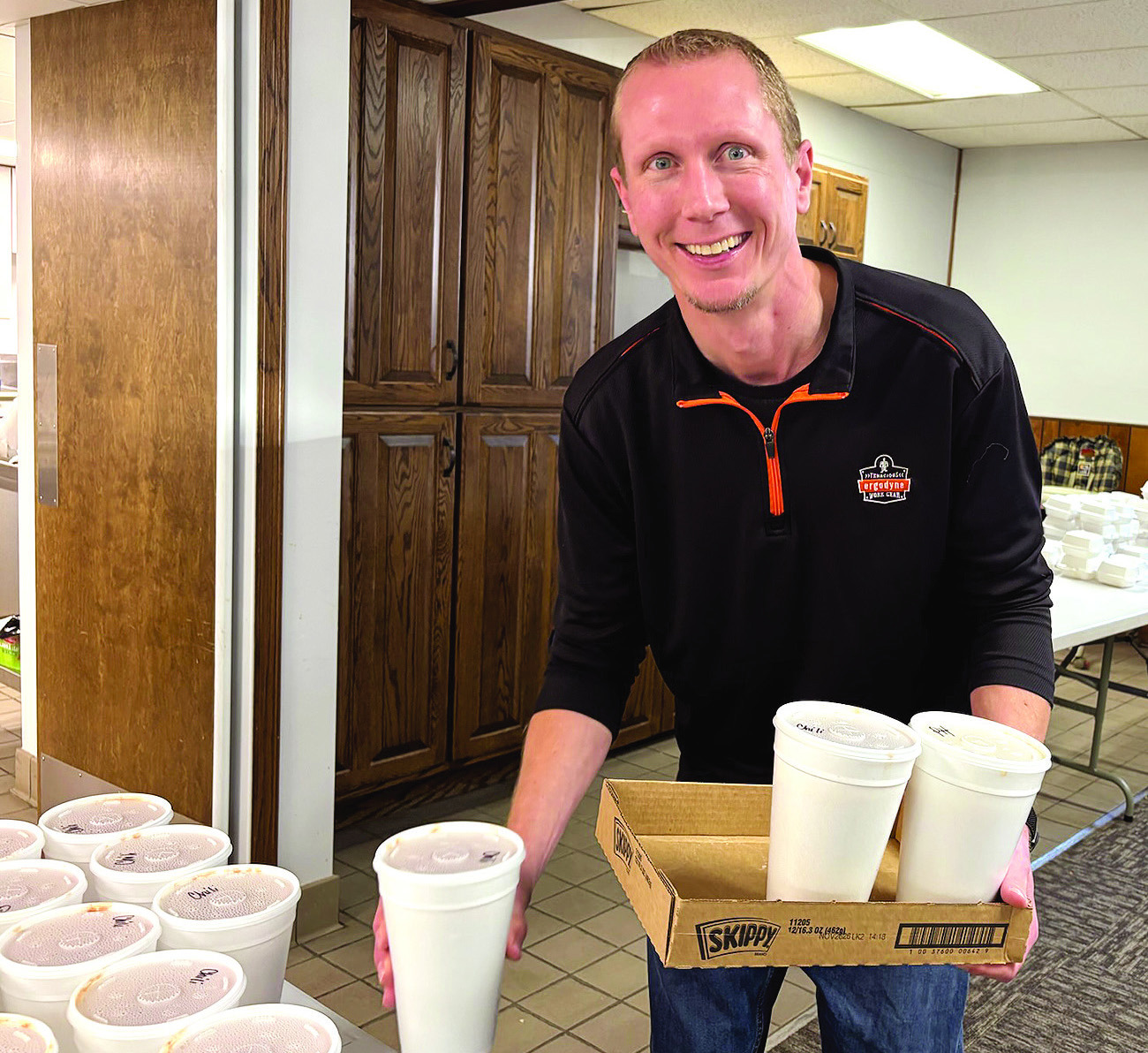 THE FOLKS AT ST. MARY’S were hard at work Sunday, making and delivering homemade soup, bread and pie for their annual Soup & Pie Dinner To Go fundraiser. Soups included cream of potato and ham, chicken dumpling, and vegetable beef. Chili and fresh bread were also on the menu. ABOVE: Darin Louwagie carefully ladels soup into a cup for another order. ABOVE, RIGHT: T.J. Kor loaded up a handful of soup. RIGHT: Evelyn Buyck delivered the first bundle of food outside the church. Photos / Per Peterson