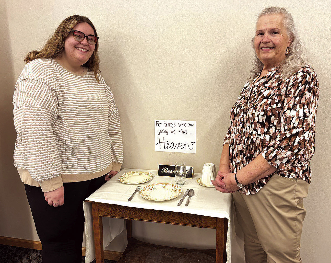 TRACY ALLIANCE CHURCH held its annual Thanksgiving feast on Thanksgiving Day last week. Turkey, donated by Tracy Food Pride, was the centerpiece, but the church also served up mashed potatoes, stuffing, buns, deviled eggs and dessert. TOP LEFT: Rick Haberman and Eric Nelson were in command of the kitchen early, preparing gravy and stuffing with a smile. Sam Sahlstrom donated potatoes, and the pies and deviled eggs were homemade. TOP RIGHT: Christina Flesner filled egg halves with creamy filling. LEFT: Katie and Dawn Medford stand next to a special touch at this year’s meal— a set of China that belonged to her grandmother, Dorothy, who married Ray Vickerman in 1920 in Tracy. “I think it was her wedding china,” Dawn said. “We did this for those of us joining us from heaven this year. We lost a couple of fantastic church members and decided that we needed to honor them.”