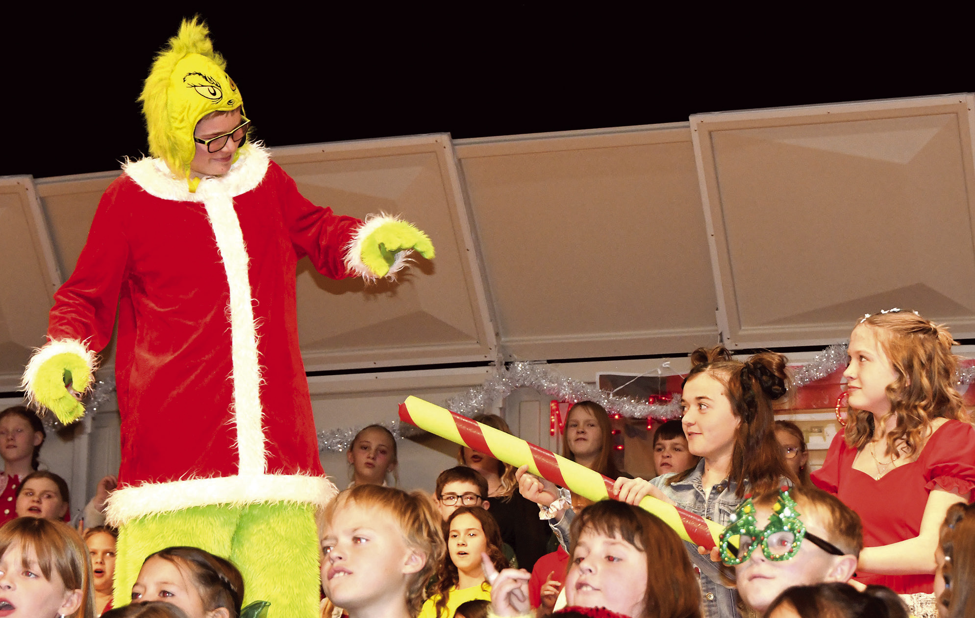 WHOVILLE KIDS teased “The Grinch,” played by Charley Johnson, with the 10-foot pole, an object made famous by the tune, “You’re a Mean One, Mr. Grinch.”