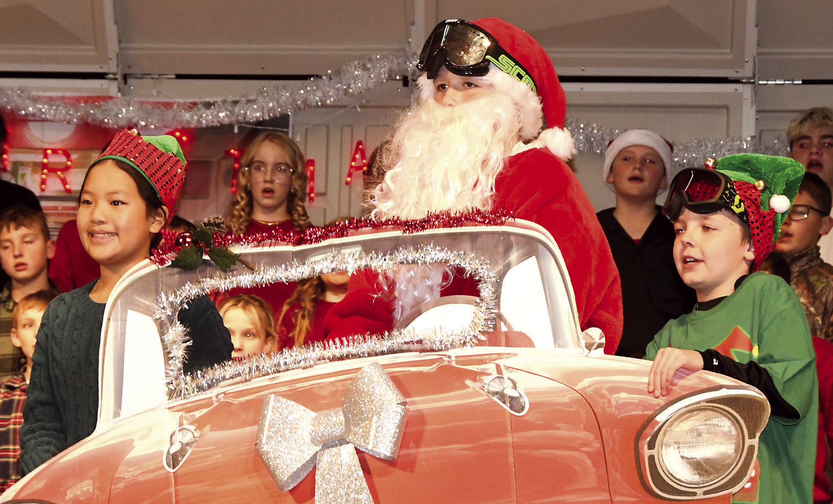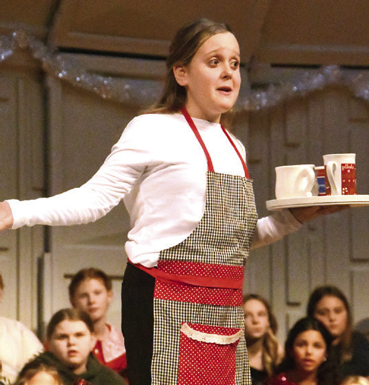 SANTA (SOREN CARLSON) was accompanied in his hot rod by two of his elves: Marilyn Vang and Landon Luckhardt. LEFT: OLIVIA SAZAMA portrayed a busy waitress in the diner that was home to the “Jingle Bell Jukebox.” BELOW: EMMA SWAN was one of the snowflakes for Monday’s show.