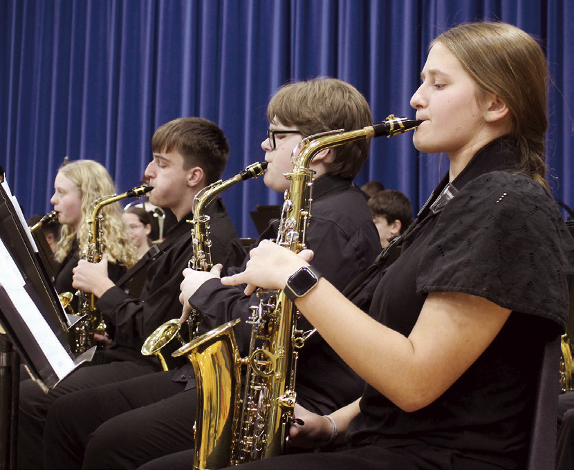 ABOVE: THE TAHS junior high choir sang three songs for the audience Monday. RIGHT: Madelyn Elsen (right), Wyatt Klein, Braeden Connor and Sophia Harsh make up part of the alto sax section of the senior high band. BELOW, RIGHT: Accompanying the choirs Monday were, from left: Vicki Striefel, on the piano, Shelbi Grimley on the violin, Katelyn Elton on the flute and Samson Obel on the cello. LEFT: Junior high choir members Kerrigan Knapper, Harper Landuyt, Kynlie Bornitz and Ava Lightfoot.