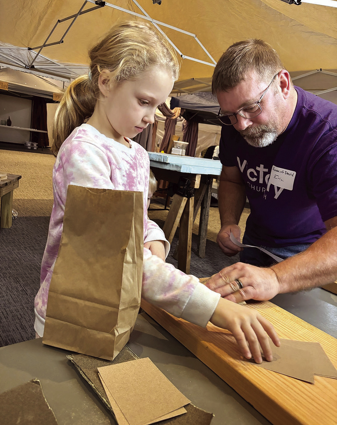TOP, LEFT: HALEY MCCARTHY helps her son, Roman pound a nail into a piece of foam board at the Carpenter’s Shop. LEFT: Eric Wichmann assists Nevaeh McCarthy as she sands a piece of lumber in the shop.