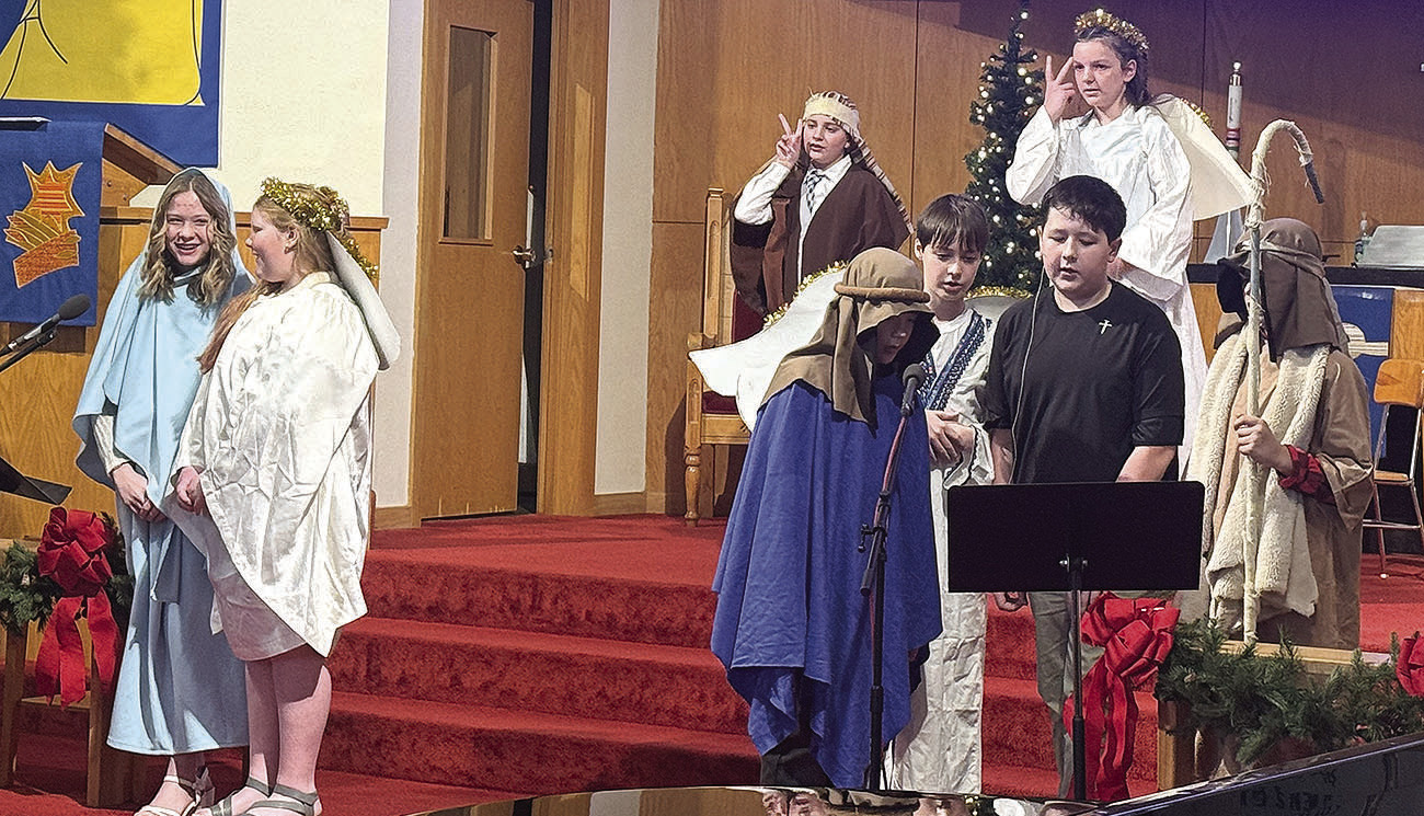ABOVE: PRE-K, KINDERGARTEN and first-graders sang “Away in the Manger” as part of the Children’s Christmas Program at Tracy Lutheran Church on Sunday. RIGHT: The fifth- and sixth-grade students sang and signed “Silent Night “during the program. About 40 Sunday school students participated in the nativity story. Photos / Tara Brandl