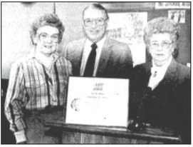 AMERICAN ASSOCIATION FOR RETIRED PERSONS received its charter in 1996. At right is Petra Cook, statewide officer who presented the charter. Receiving the charter are local officer Aida Mae Brewster and Vern Grinde.