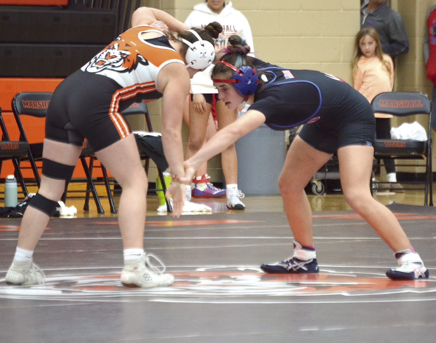 RAELYNN SCHREIER goes for the pin against Marshall’s Morgan Grimmer at 136 pounds.