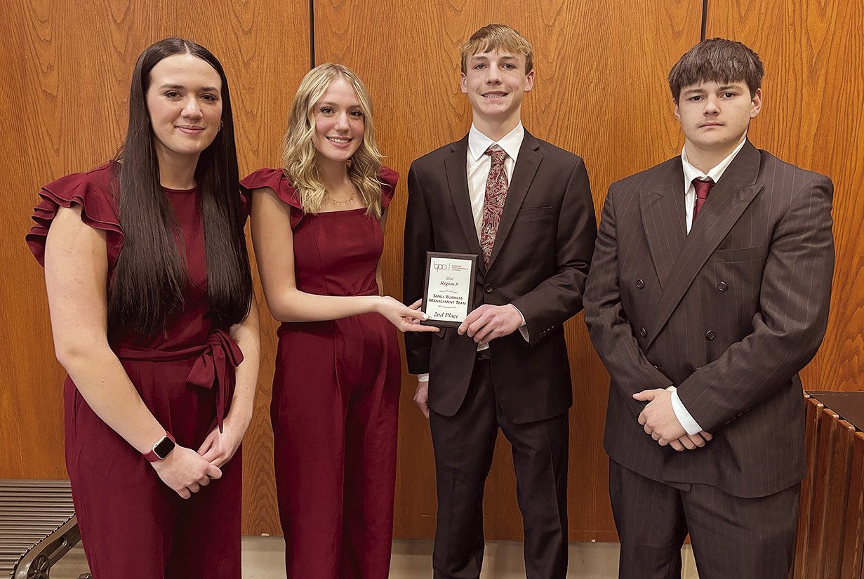 The Small Business Management team of first-year BPAers Taylor Squires, Hailey Hubner, Adam Hippe and Makayla Erickson took second place. This category gives the students a business profile and some of the problems that the business is facing. The students then must put together suggestions for how to solve those problems with the business.