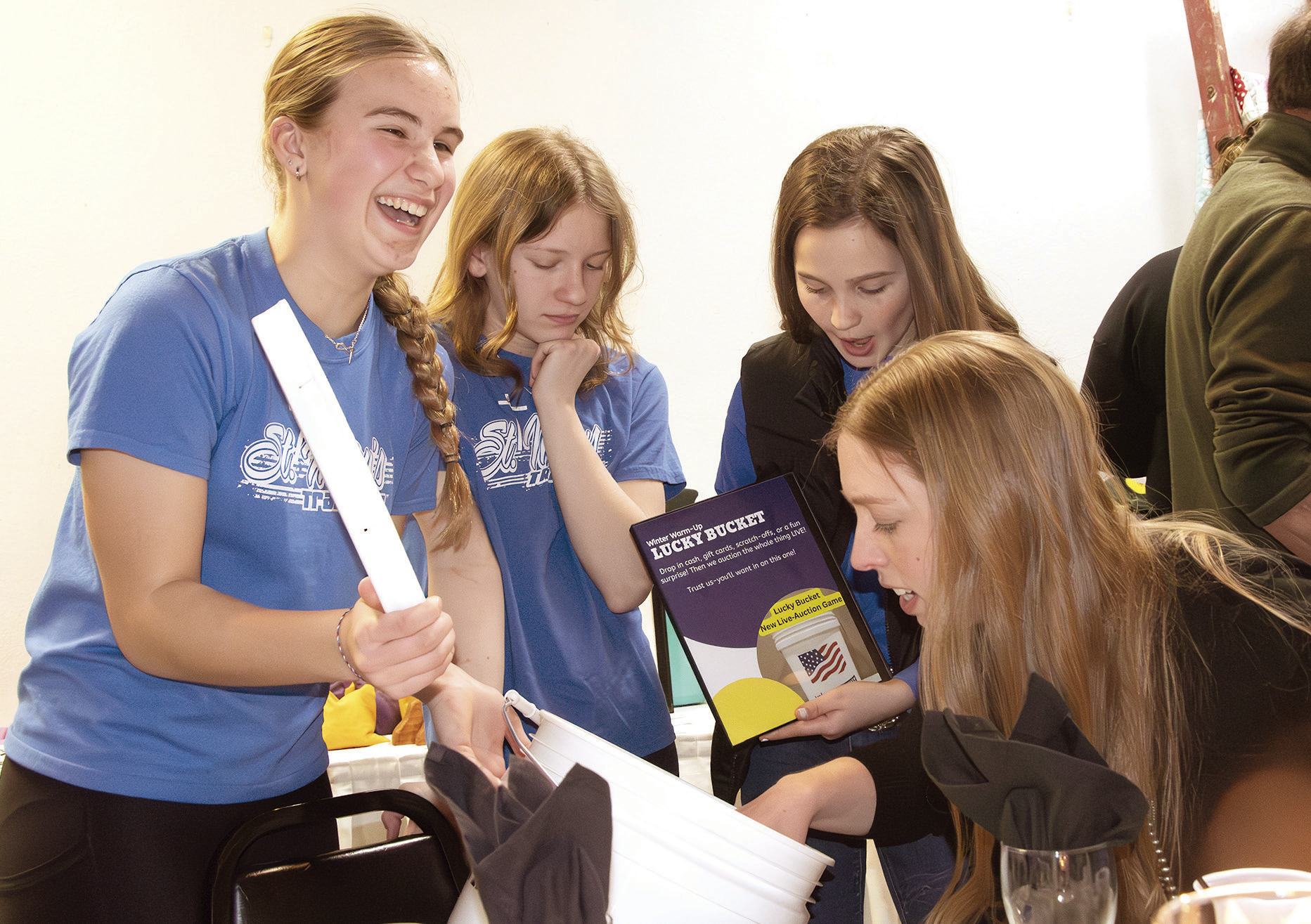ST. MARY’S SCHOOL ALUMNI AUDREY NELSON, CAROLINE LANOUE AND EVELYN BUYCK show off the “mystery bucket” to Brittany Wulf at Saturday’s Winter Warm-Up. The bucket was filled by attendees and included items like lottery tickets, gift cards and cash. Photos / Per Peterson