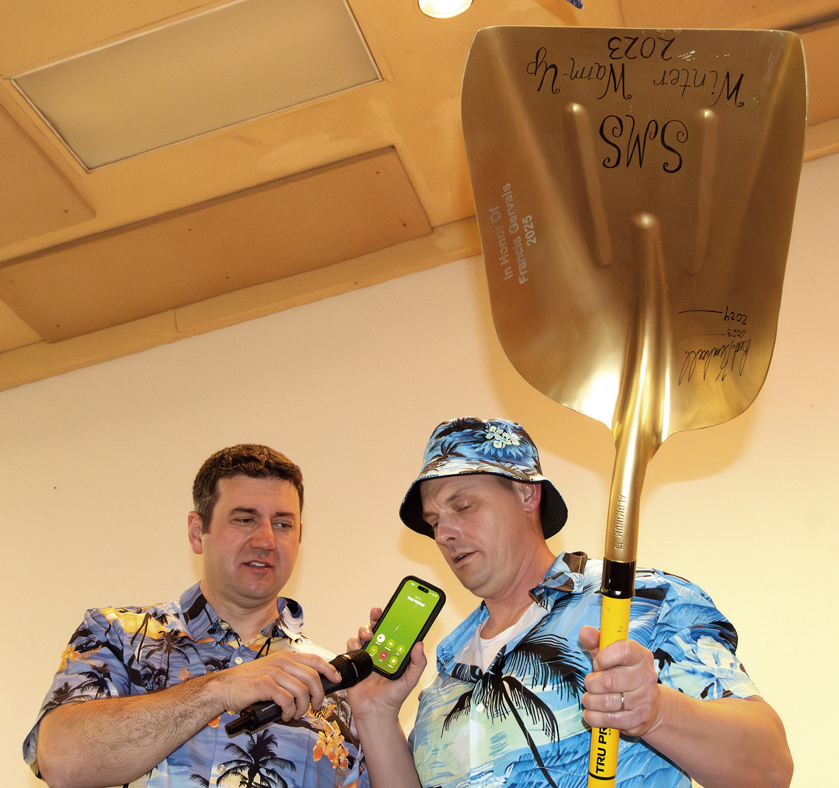 There was also another friendly fight for the coveted “Golden Shovel,” and this year’s bidding had a unique twist, as former winner Reid Kimball made his bids remotely. Kassidy Arnold was the conduit between Kimball and the Warm-Up, holding his phone to the mic, so all could hear Kimball’s bid. The SMS father was up against Gary Johns, and the two teamed up to push the final bid to $2,450. That was just a portion of the more than $114,000 raised Saturday for the school.