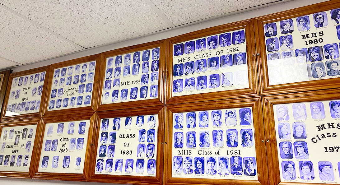 A HALLWAY OF THE MILROY PUBLIC SCHOOL tells some of its history through the faces of high school students who graced the halls before consolidation with Tracy in 1990. Photos / Sophia Gaul