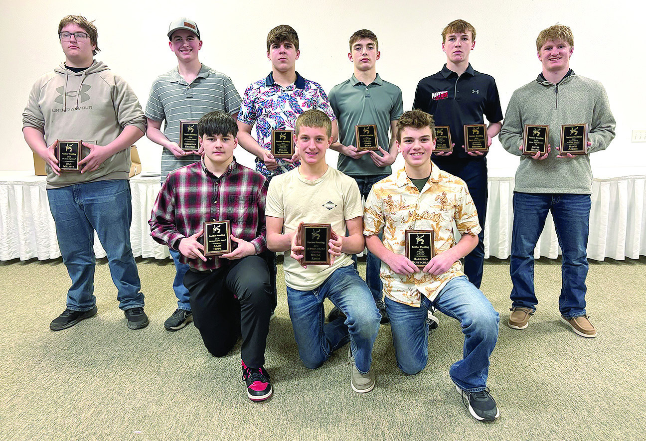 EARNING INDIVIDUAL AWARDS were, front, from left: Adam Hippe (Panther Award-varsity), Reese Krick (Wreslter of the Year), Harrison Rentschler (Rookie of the Year). Back, from left: Sam Willhite (Most Improved), Christian Fransen (Panther Award), Nolan Verlinde (Competitor of the Year), Owen Beier (Rooke of the Year-varsity), Taylor Squires (Most Falls, Most Improved), David Schuh (Most Takedowns, Most Valuable Wrestler).