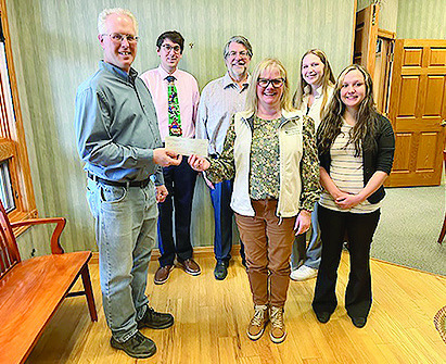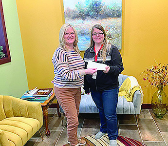 INVESTORS CHOICE has made two donations. ABOVE: From left: Tim Lange, Earl Innis, Jim and Carla Goedtke, Samantha Schreier, Zoey Brown. Not pictured: Alice Gomez. Below, from left: Carla Goedtke and Stacy Gackstetter. Submitted photos