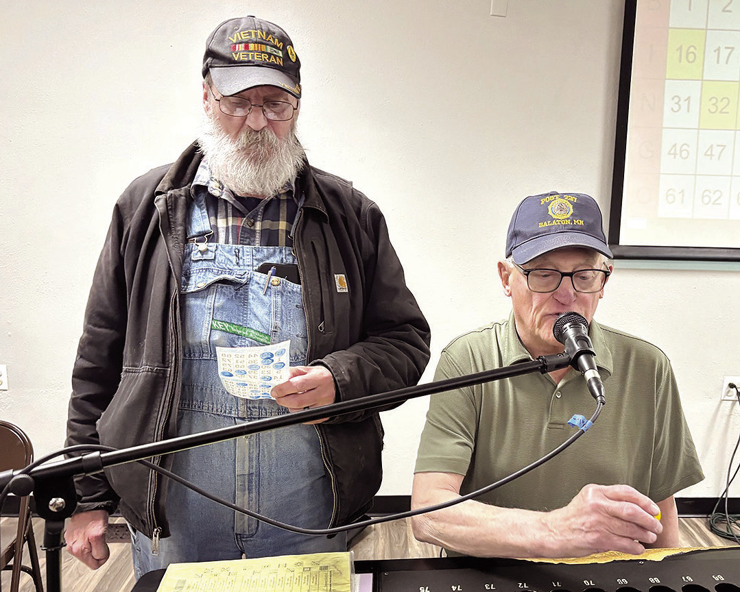THE BALATON AMERICAN LEGION hosted bingo at the community center last week. ABOVE: Legion Auxiliary member Jill Gilman stayed busy hading out bingo cards to players. RIGHT: Steve Livingston waits to present a potentially-winning card as Lynn Wichmann calls out a number. Photos / Per Peterson