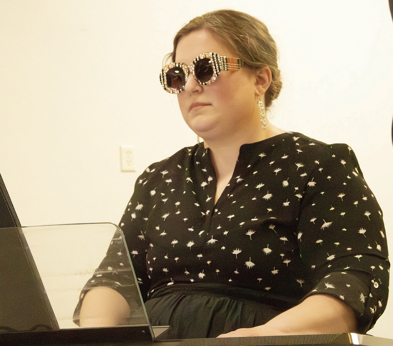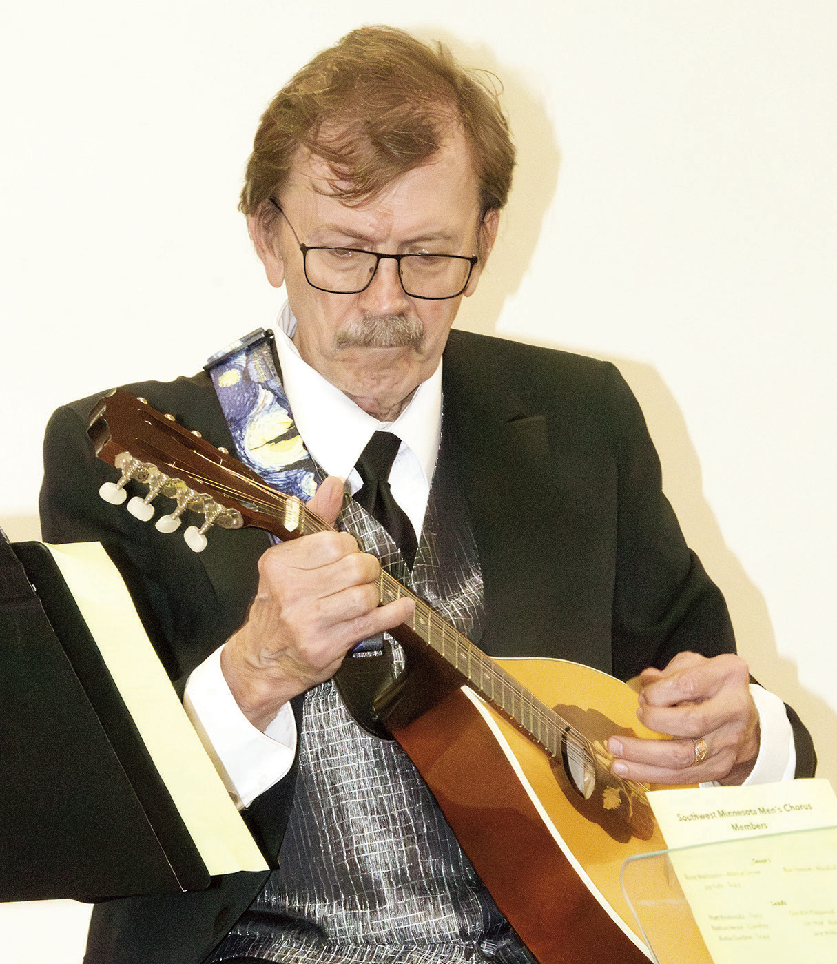 LEFT: GLENN ANDERSON backed up the chorus on his instruments for a number of selections Sunday. RIGHT: Kirsti Malmberg did her best Elton John impersonation when the chorus sang “Goodbye, Yellow Brick Road.”